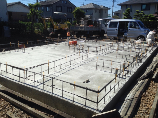 配筋検査後 ベースコンクリートを打ち、基礎立ち上がり部分高さを測っています!