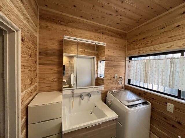 脱衣室の壁と天井は木の香りが漂う音響熟成木材だから暖かくて気持ちが良い。